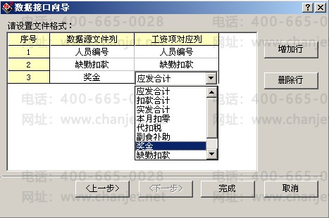 b、点击“下一步”,在出现的界面设置如下图,其中“数据源文件列”为excel中的字段,“工资项对应列”为软件中的项目名称,两列要对应起来设置。