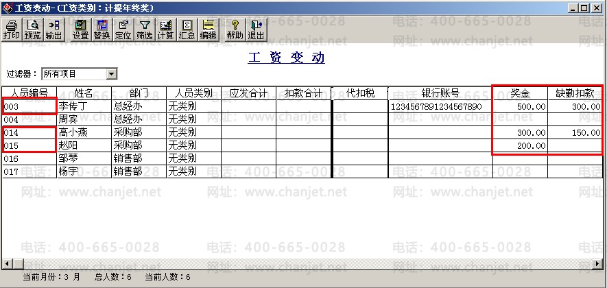 (5)数据导入完成后,打开工资变动,对应人员的“奖金”和“缺勤扣款”就根据excel中的带出。