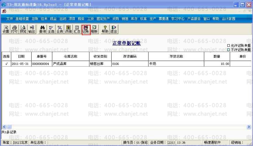 3、进入核算管理,点击正常单据i记账,选择那张销售出库单,点击"记账”按钮;