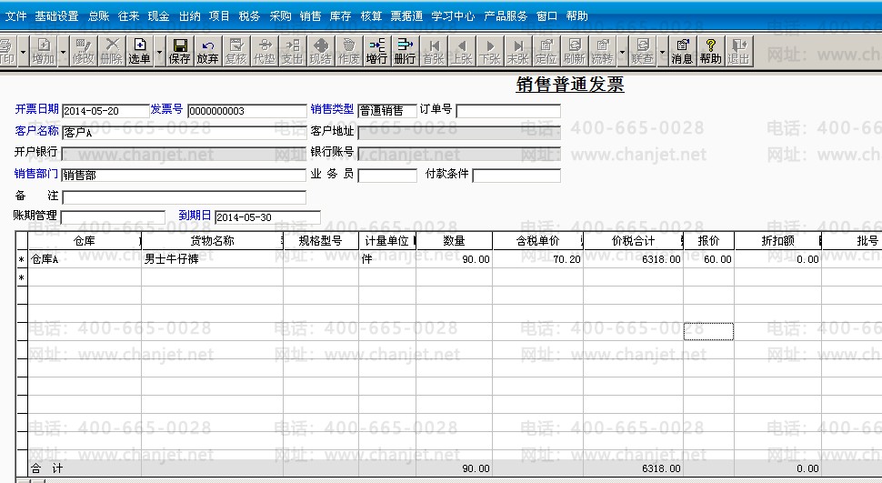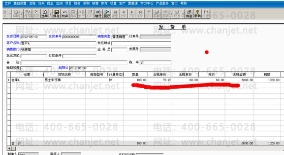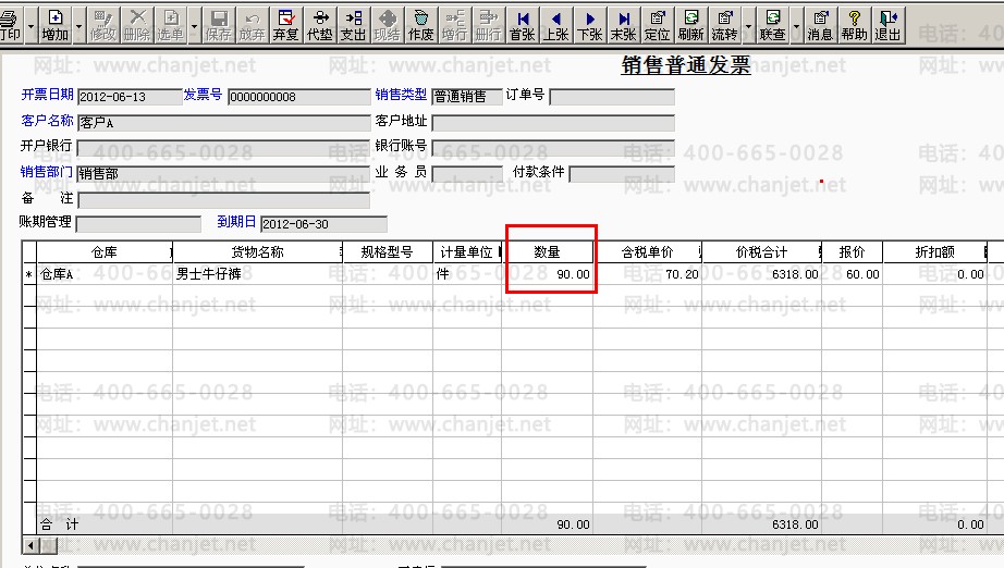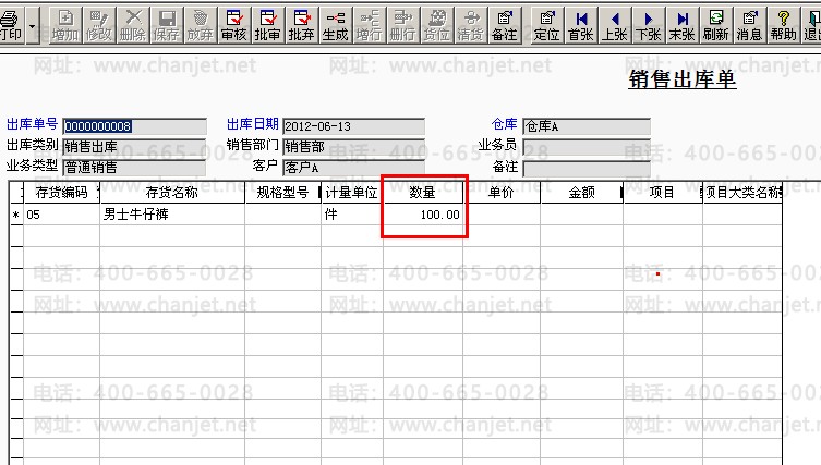举例:**公司销售牛仔裤100件给客户A,单价60元,实际发货单和出库单中都是100件,销售发票中的数量是90件。