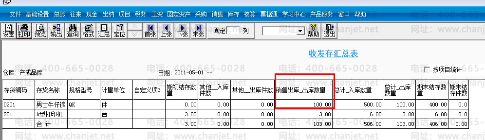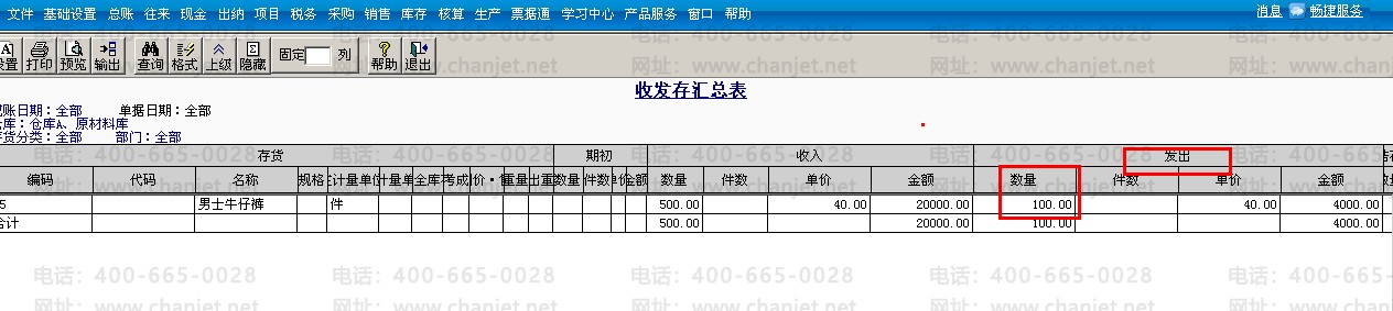 5.记账后,查看收发存汇总表中,可以看到是以销售出库单中的100件来计算成本。