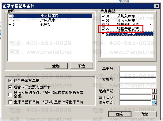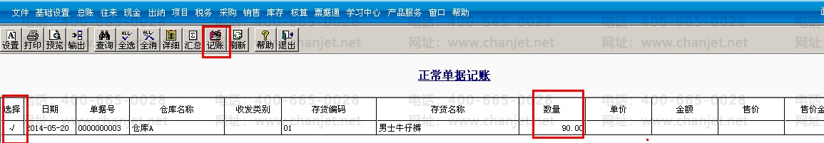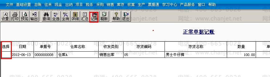 2..在核算管理中点击正常单据记账,选中仓库,在单据类型中对该销售发票进行记账。