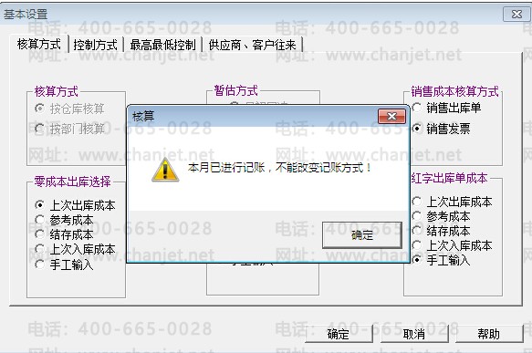 问题现象一、在核算模块的业务范围设置时,调整销售成本的核算方式时,提示“本月已进行记账,不能改变记账方式”(如下图)