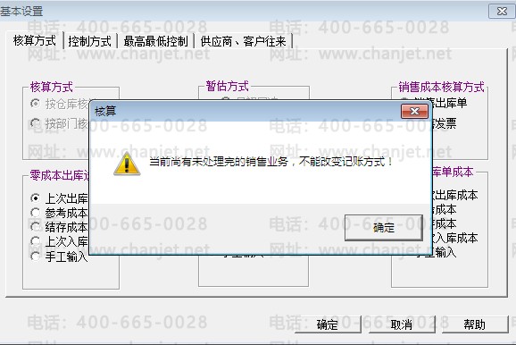 问题现象二、在核算模块的业务范围设置时,调整销售成本的核算方式时“当前尚有未处理完的销售业务,不能改变记账方式”