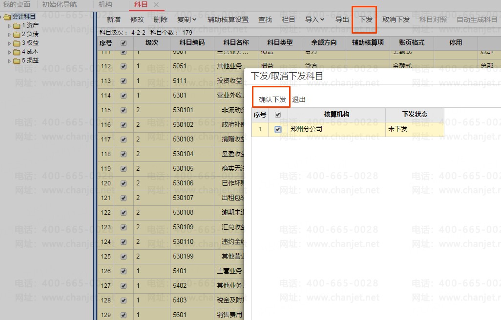 科目档案→选择科目→选择机构→下发。