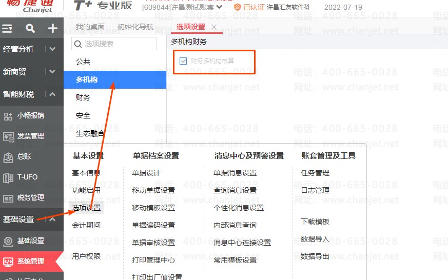 以T+专属云17.0为例,登录总部的财务账套,在系统管理—选项设置——多机构中勾选【财务多机构核算】;启用财务多机构核算后,公司单组织账套会升维成为集团多组织账套。注意:启用后不支持反启用,请慎重启用!