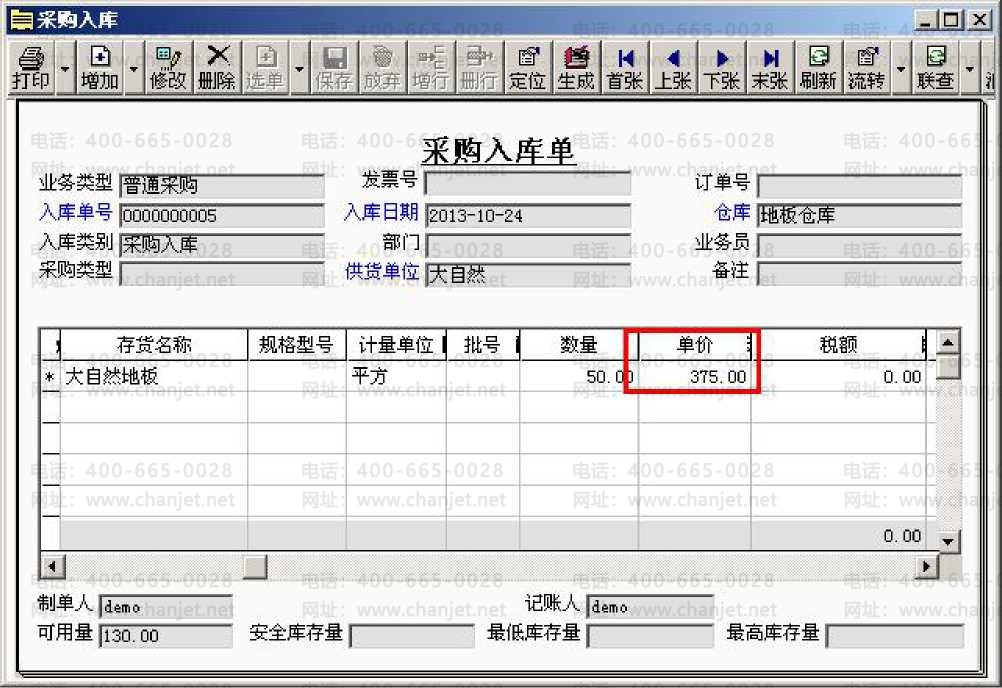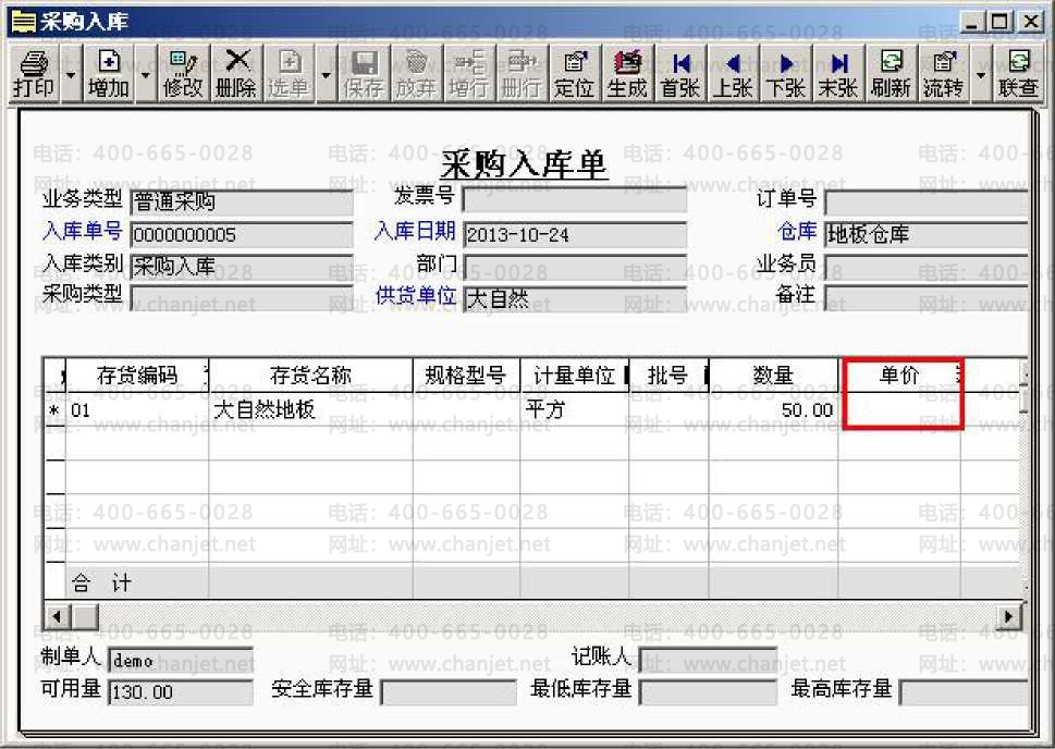 2、进入“采购管理”,点击“采购入库单”一“增加”.选择存货“大自然地板”、“数量50”、“单价为空”。