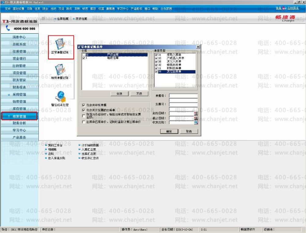 3、进入“核算管理”模块,点击“正常单据记账”,勾选“地板仓库”一“确定”,进入“正常单据记账”,勾选“单据号”一点击“记账”。