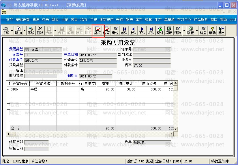 1、 点击“采购管理”-“采购入库单”,选择那张采购入库单,流转生成采购专用发票,点击“复核”;