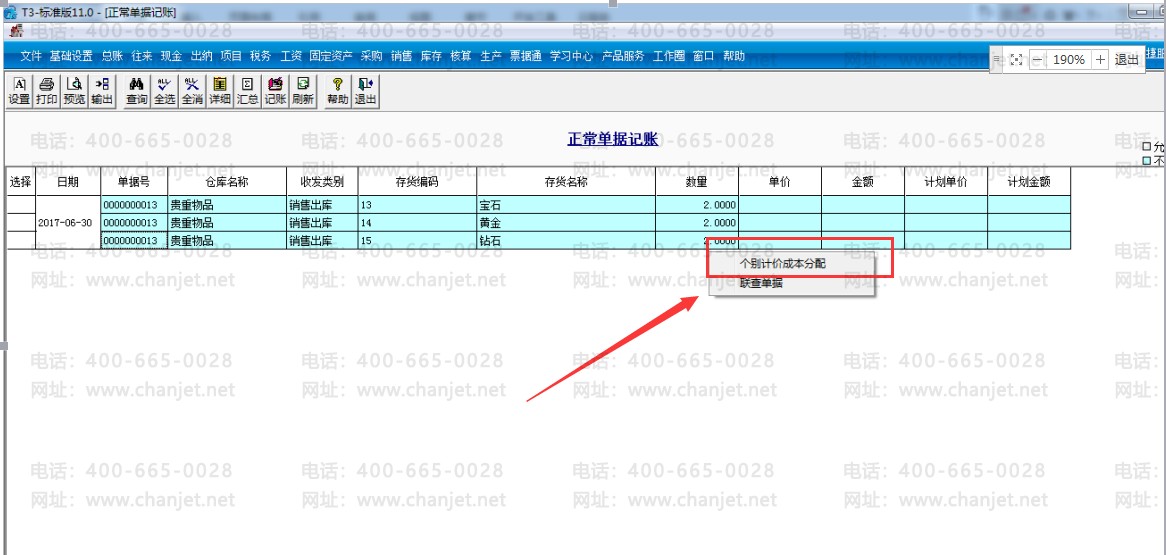 2.右键点击,选择“个别计价成本分配”逐一分配成本