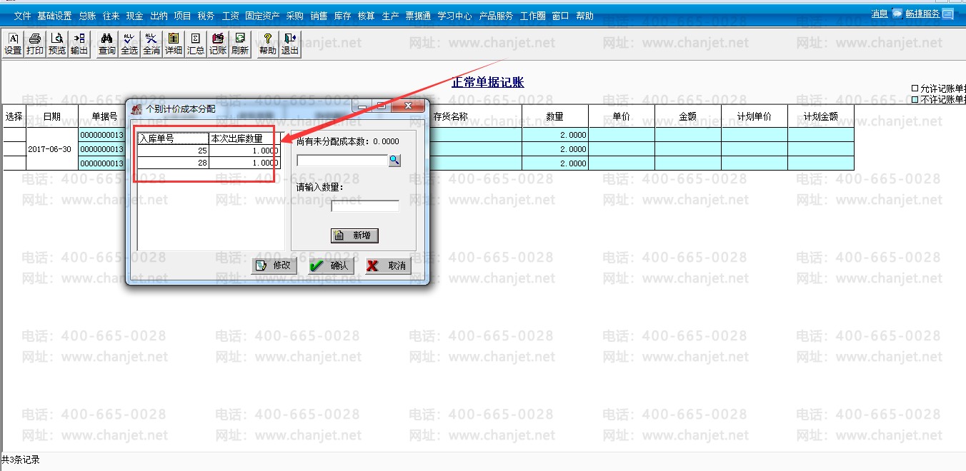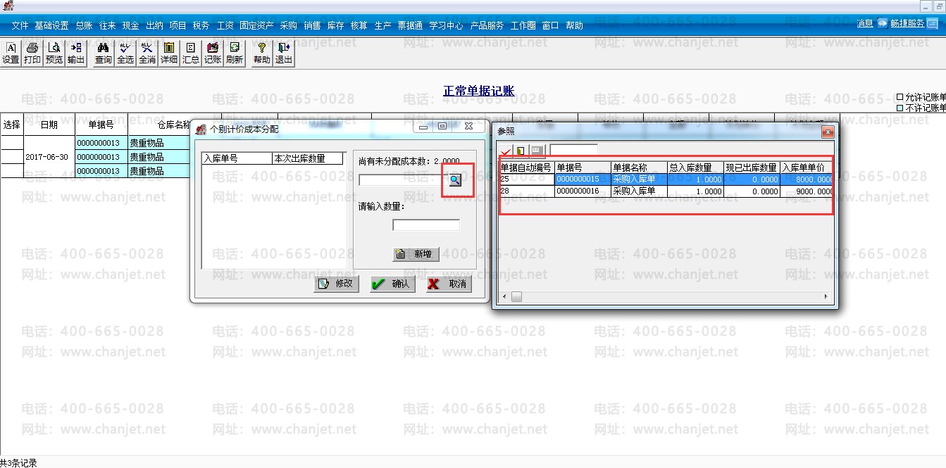 1. 点击放大镜,选择入库记录分配成本,依次点击两张单据的两条记录,分别输入数量为1和1,点击新增,结束该存货后确认。