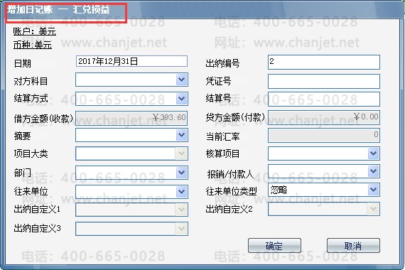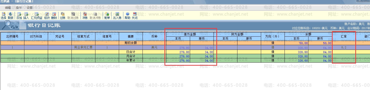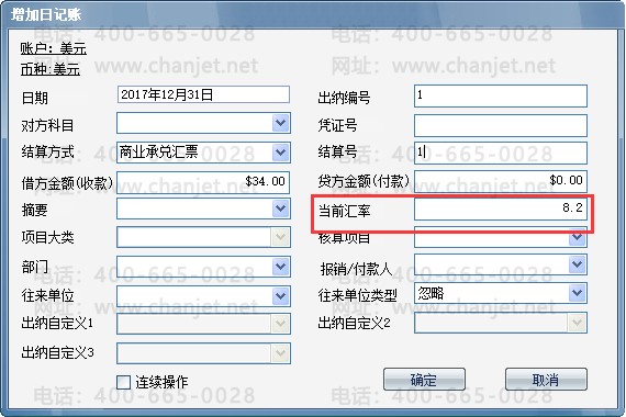 添加美元日记账时,可录入日记账当前汇率,软件自动换算出本币金额;