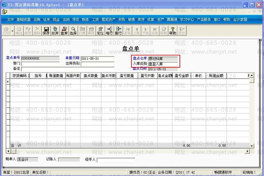 1、点击"库存管理库存盘点”-增加,盘点仓库选择"原材料库”,入库类别选择"盘 盈入库”;