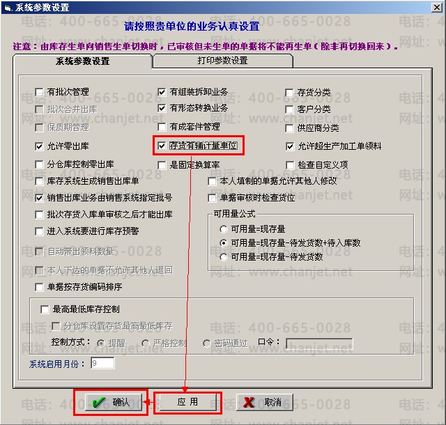 2、勾选“存货有辅助计量单位”,点击“应用”--“确认”