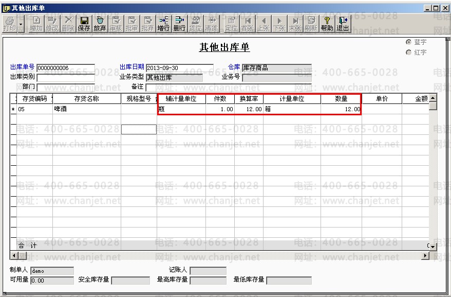 6、填制其他出库单,可以看到即体现了1箱,又体现了12瓶