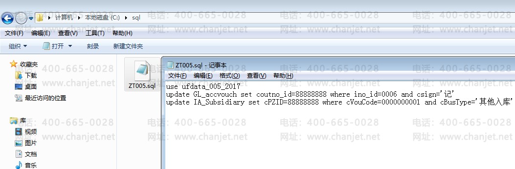 e. 最后点击【文件】下的【保存】后,再将文件名重命名为ZT005.sql。(注:本例以【005】账套【2017】年一张单据号为【0000000001】号,业务类型为【其他入库】的其他入库单生成凭证后再进行冲销生成的凭证号为【0006】号凭证,类别字为【记】的凭证为测试)