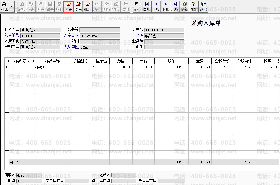 (2)2016 年 1 月 31 日采购存货 A10 个,单价$10.00,填制采购订单: