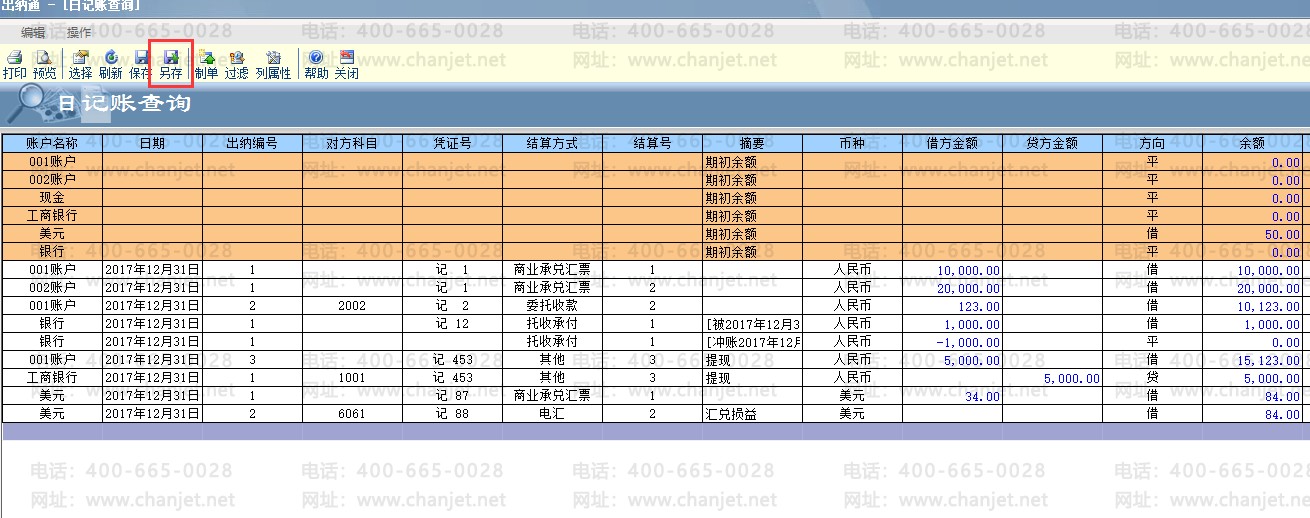 查询界面显示所有的账户记录,点击菜单栏“另存”,保存本查询方案