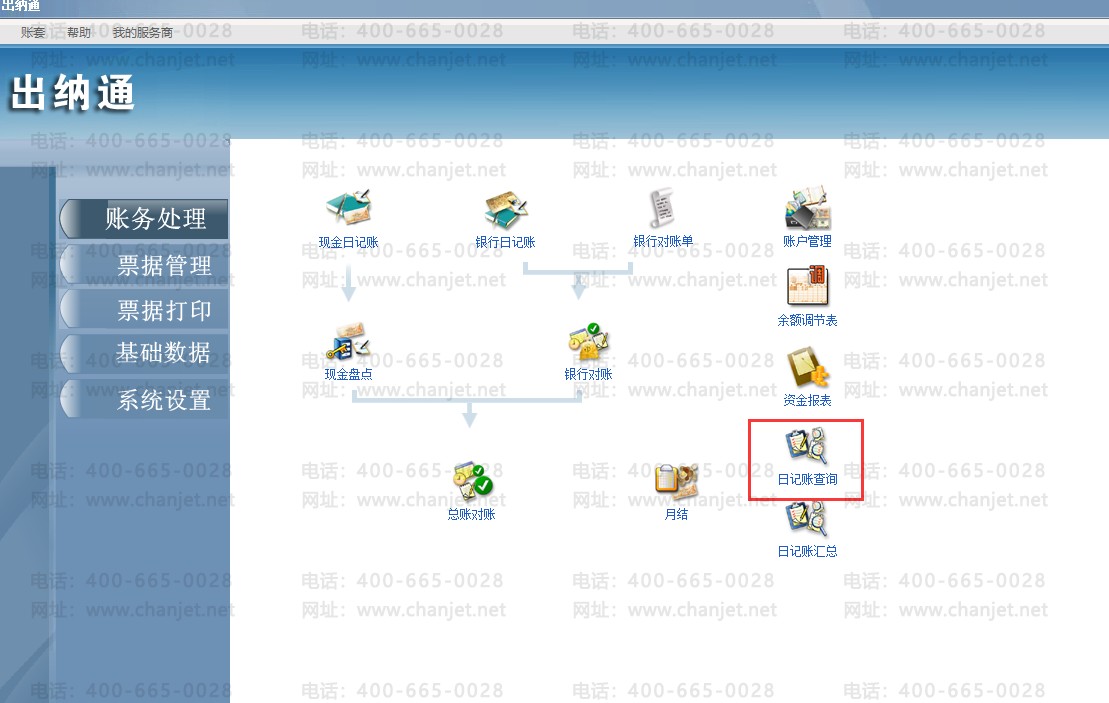 点击出纳通登录,“账务处理”—“日记账查询”中可通过条件筛选查看所有账户日记账记录。