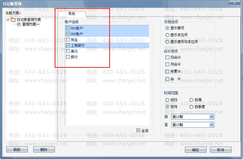 (2)勾选所有的日记账账户并设置时间范围查询
