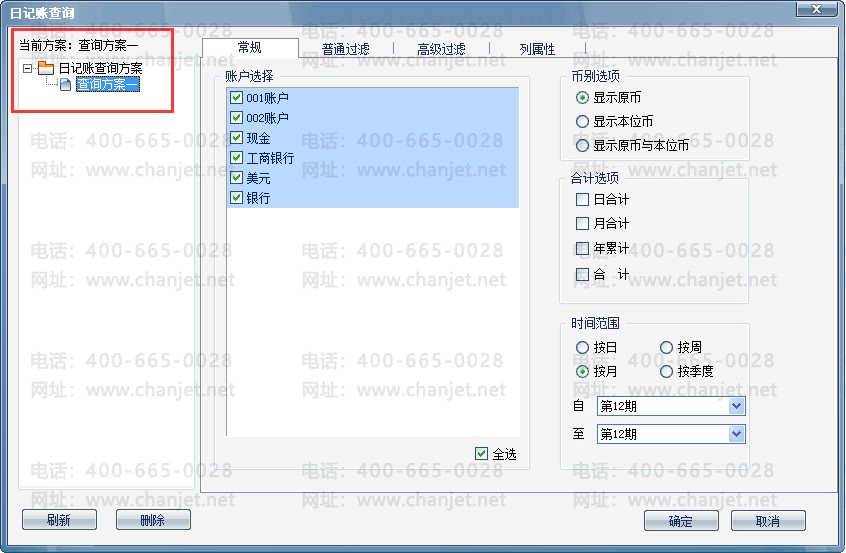 (4)重新查询时,在左边的日记账查询方案中显示刚刚设置的查询方案:“查询方案一”,选中后,查询条件中就会自动默认勾选所有的日记账账户,点击确定,查询结果与刚刚相同。