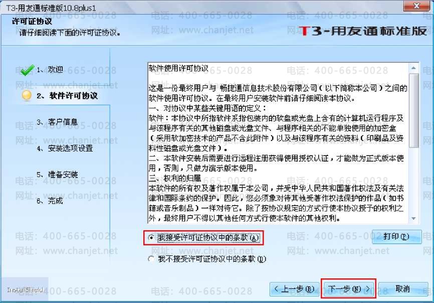 (3)选择"我接受许可协议中的条款"再点击"下一步"。如下图所示: