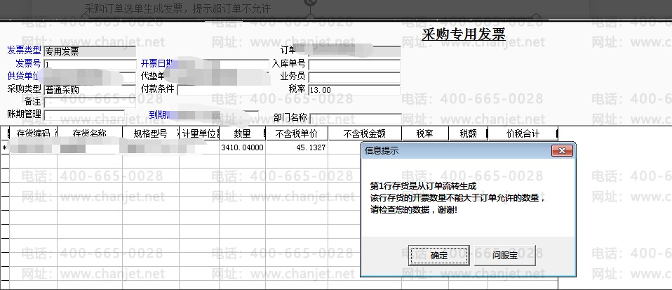 畅捷通T3采购订单选单生成发票,提示超订单不允许