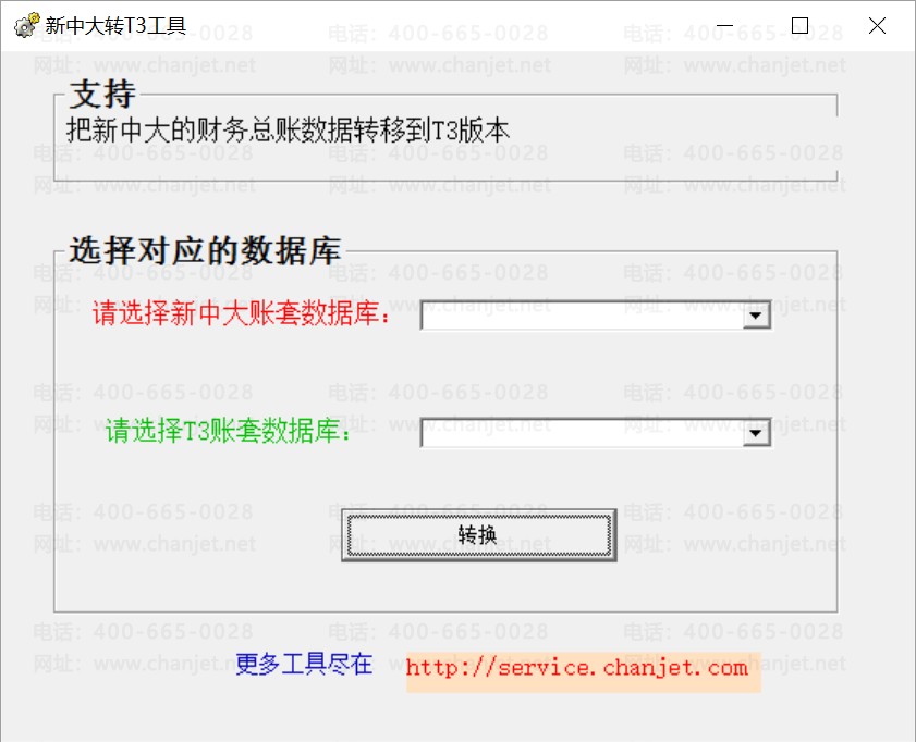 4、确认新中大数据库和T3数据库输入无误之后,点击“转换”按钮。