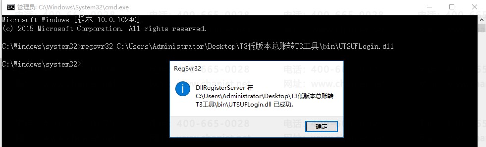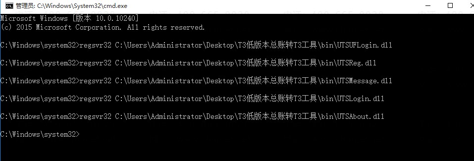 (3)在打开的cmd.exe中,录入regsvr32,空格,然后复制粘贴工具下bin的路径,接着将UTSUFLogin.dll文件录入,如:regsvr32 C:\Users\Administrator\Desktop\T3低版本总账转T3工具\bin\UTSUFLogin.dll,或可参照下图: