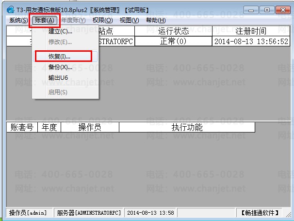 8.在将账套进行恢复:以系统管理员的身份登入,点击账套下的恢复