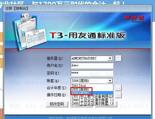 9.在T3登录界面有两个相同账套【002】案例1和【006】案例1: