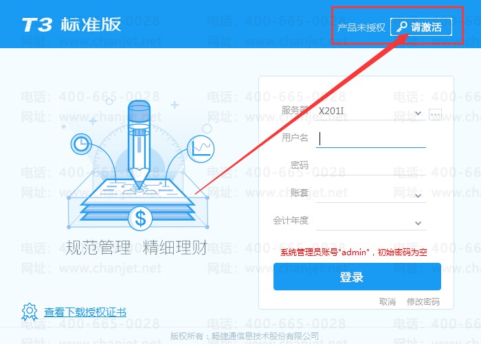 1.在T3登录界面点右上角“请激活”如图所示。
