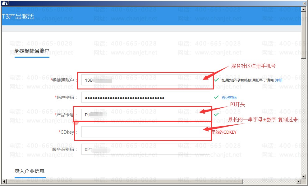 2.输入畅捷通账号,密码,卡号,CDkey,账号在畅捷通服务社区用手机号注册https://service.chanjet.com/,卡号和CDkey复制。