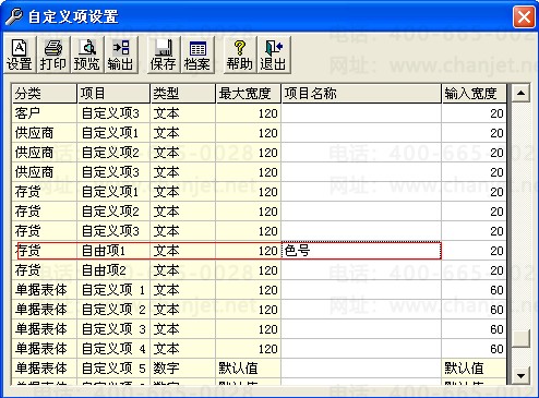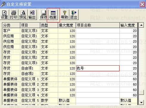 2.在自定义项设置中,存货自由项对应的项目名称录入“色号”。