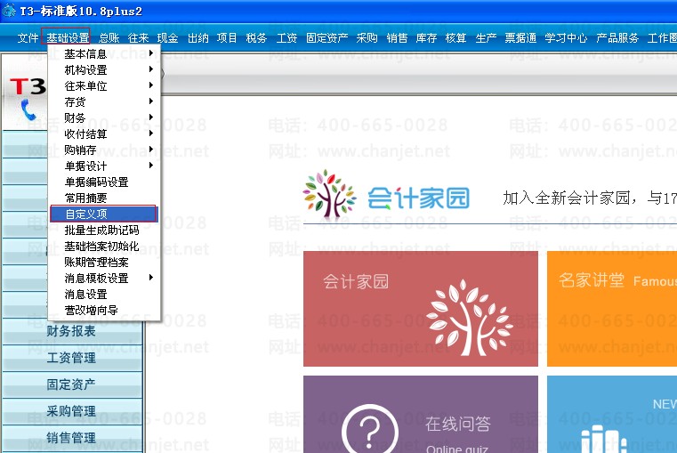 1. 登入T3软件,点击“基础设置”—“自定义项。