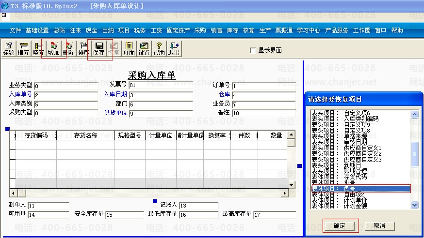 7. 点击“基础设置”—“单据设计”—“采购入库单”单据设计添加色号,点击确定后保存。(注:如果想其他单据也显示色号,只要在单据设计中对该单据进行设计也可以正常显示)
