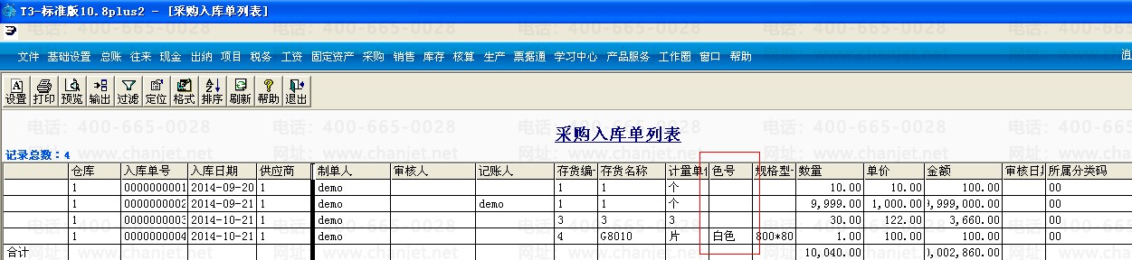 8.在采购管理模块,新增一张采购入库单,可以看到色号已经显示出来了。