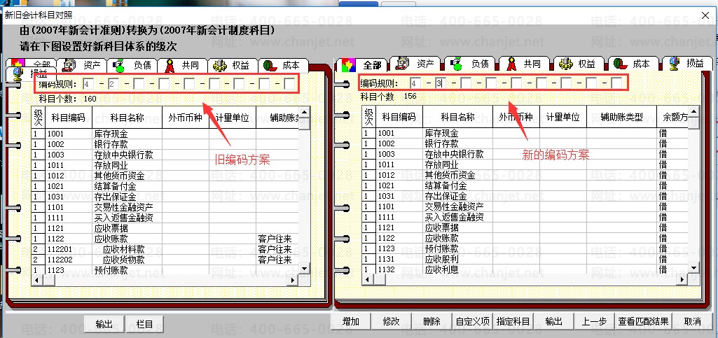 3.进入【新旧会计科目对照】界面,左侧窗口为账套目前的编码方案,右侧窗口可为账套设置的新的编码方案,如将账套第2级科目编码规则定义的2修改为3。