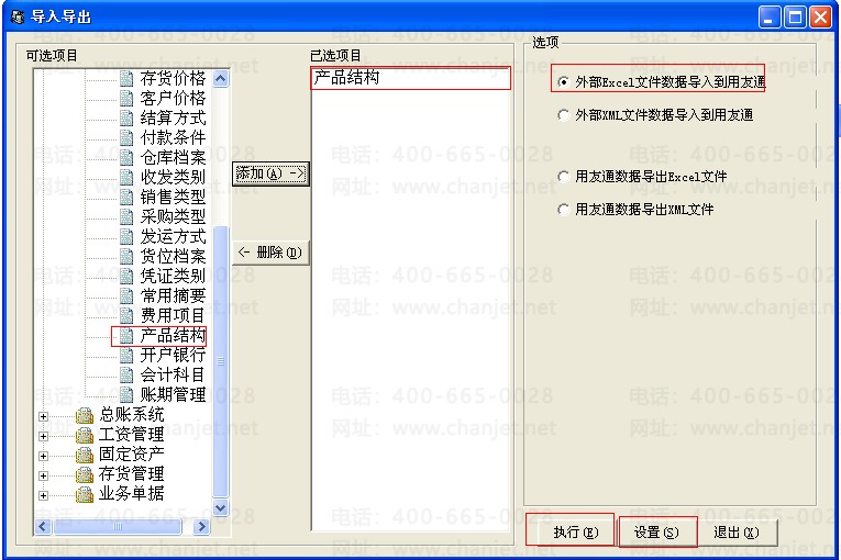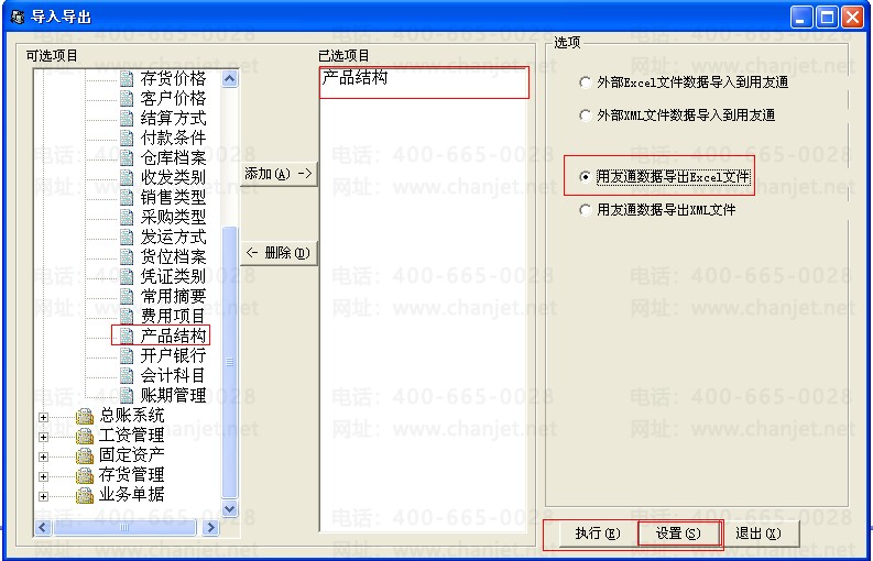 3、点击“数据导入导出”完后,进入“导入导出”界面,选择“可选项目”-“基础档案”-“产品结构”;“已选项目”-“产品结构”;“选项”-“用友通数据导出excel文件”点击“设置”按钮,如下图;