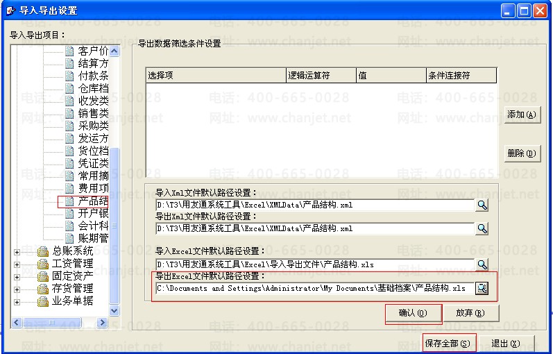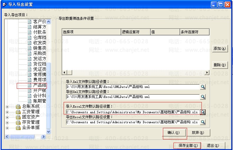 9、点击设置按钮之后,“导入导出项目”选择“产品结构”;“导入excel,默认文件路径”选择电脑桌面上“我的文档”-“基础档案”-“产品结构”文件,点击确定和保存全部按钮,退出回到导入导出界面点击“执行”按钮,会显示结果,如下图;
