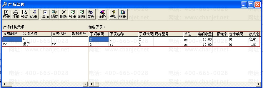 10、导入数据成功后,重新登入T3软件选着【010】 帐套-“基础设置”-“购销存”-“产品结构”,查询导入的结果,如下图;