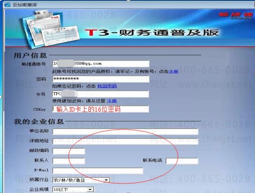 2、进入激活界面,先填写“用户信息”,分别输入畅捷通账号、密码,要激活的云加密卡号、CDkey,检测无误后再填写“我的企业信息”。