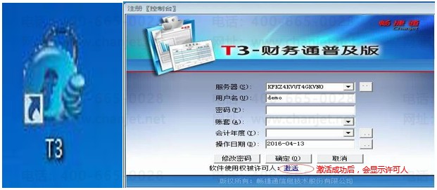 1、点击桌面上的T3软件门户标志 ,打开注册控制台后同样点击激活的位置。