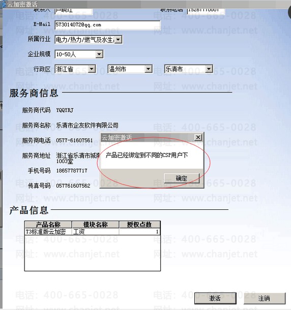 5、点激活时提示“产品已经绑定到不同的CSP用户下”。这是因为该云加密产品已经绑定到另外一个账号了,请先输入云加密卡号和CDKEY,会弹出之前绑定的畅捷通帐号,再利用帐号找回密码即可。