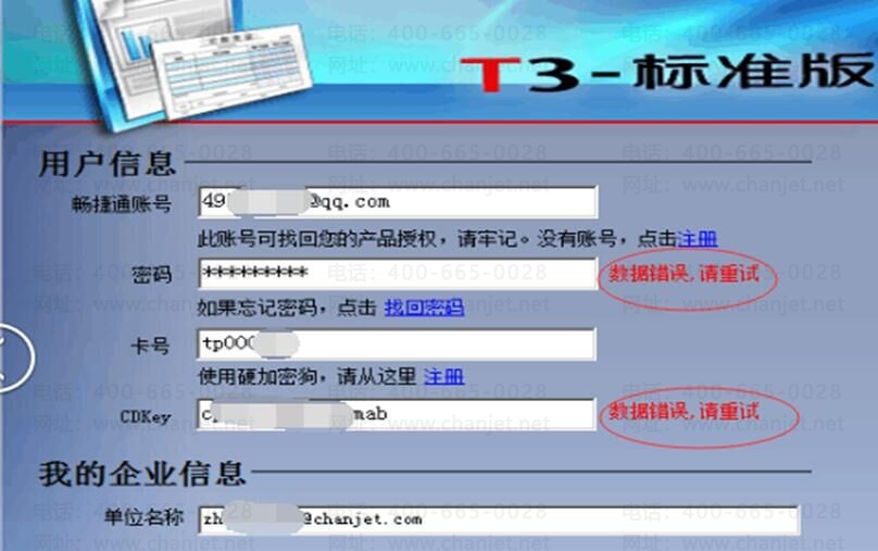 3、T3-11.0云激活时畅捷通帐号密码及CDKEY均提示数据有误问题。