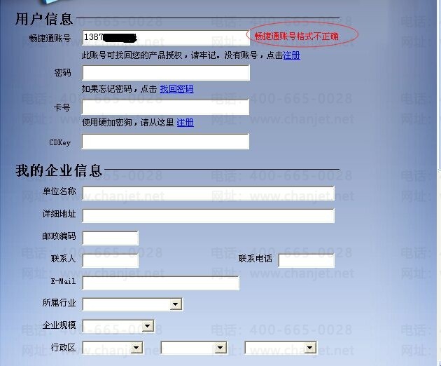 2、如激活时填写手机账号报“畅捷通账号格式不正确的”的提示,需要打上T3-11.0的补丁,打补丁后云加密即可支持手机号码注册。