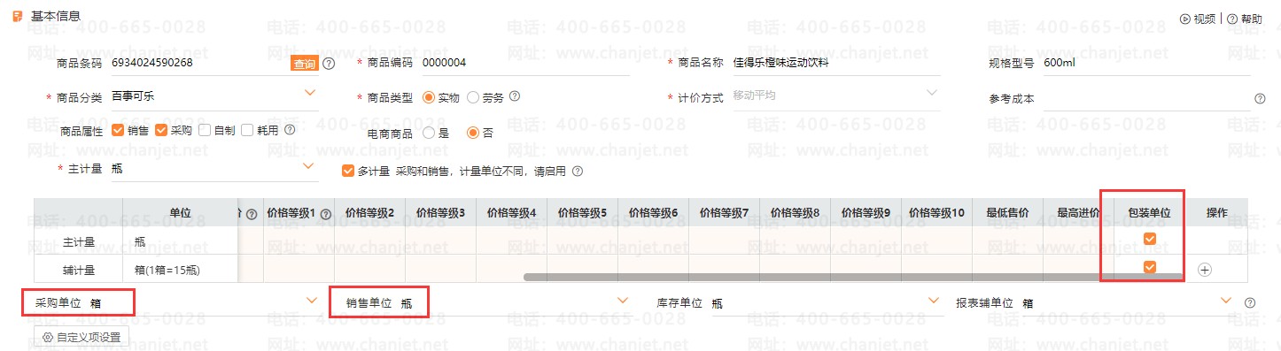 首先,我们在编辑商品和新增商品时,勾选“多计量”,以小单位为主单位哦,辅计量使用大单位。举个例子:佳得乐橙味运动饮料以“瓶”销售按“箱”采购,就可以主计量设置为“瓶”,辅计量为“箱”。下方的采购单位是“箱”,销售单位是“瓶”,包装单位都勾选上。