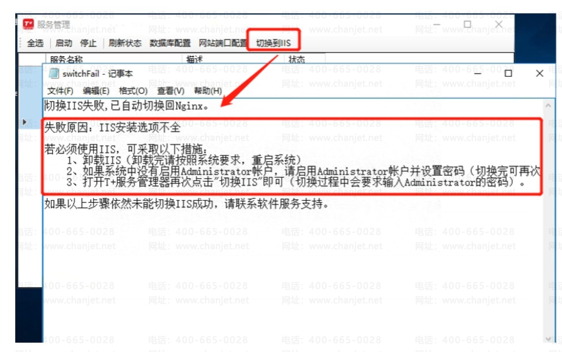 完成修改之后,然后再去打开T+服务管理器去操作切换iis即可成功。