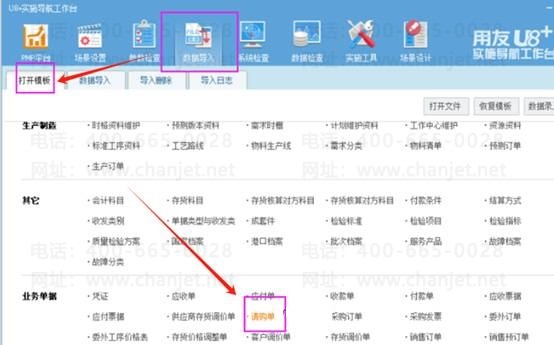 1、以导入请购单为例,打开用友U8+实施导航工作台,点击数据导入-打开模板-请购单,如图下操作:
