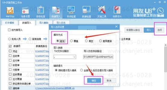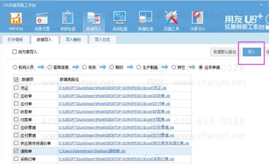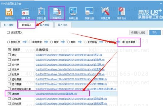 3、模板录入完成后,打开实施导航-数据导入-数据导入-业务单据,勾选请购单,右边数据表路径选择对应维护好数据的excel表所在的路径,选项中操作方式选择为追加后导入,如图下操作: